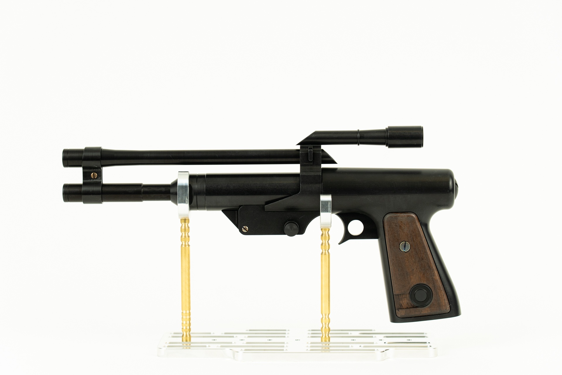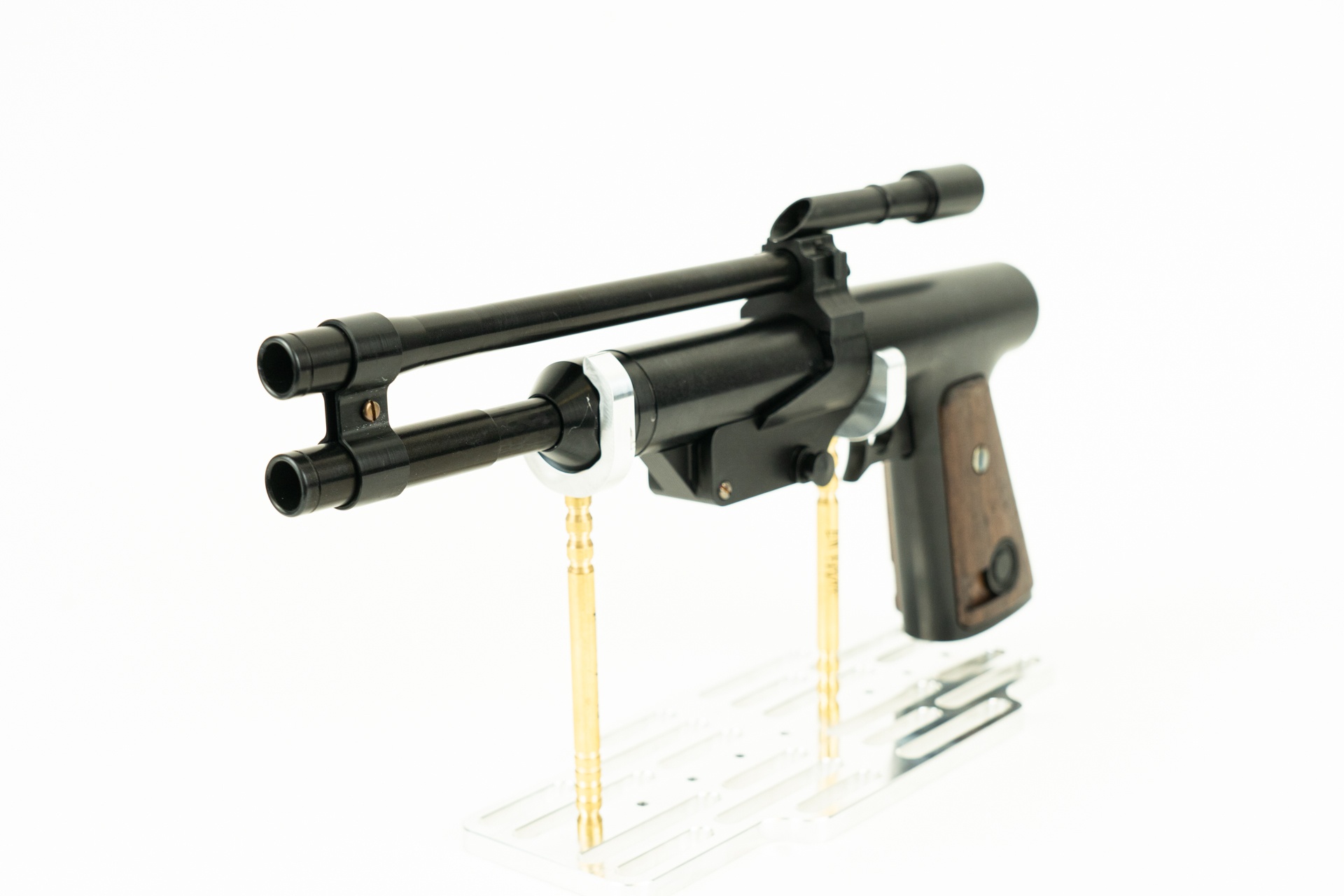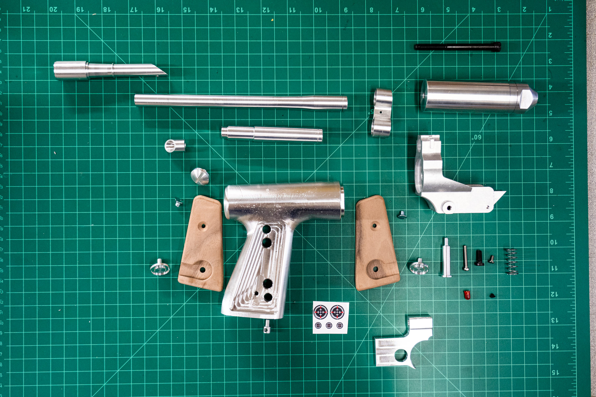 Available in raw aluminum kit form (needs assembly and painting) or assembled black aluminum anodized version. Both come with stained wood grips.