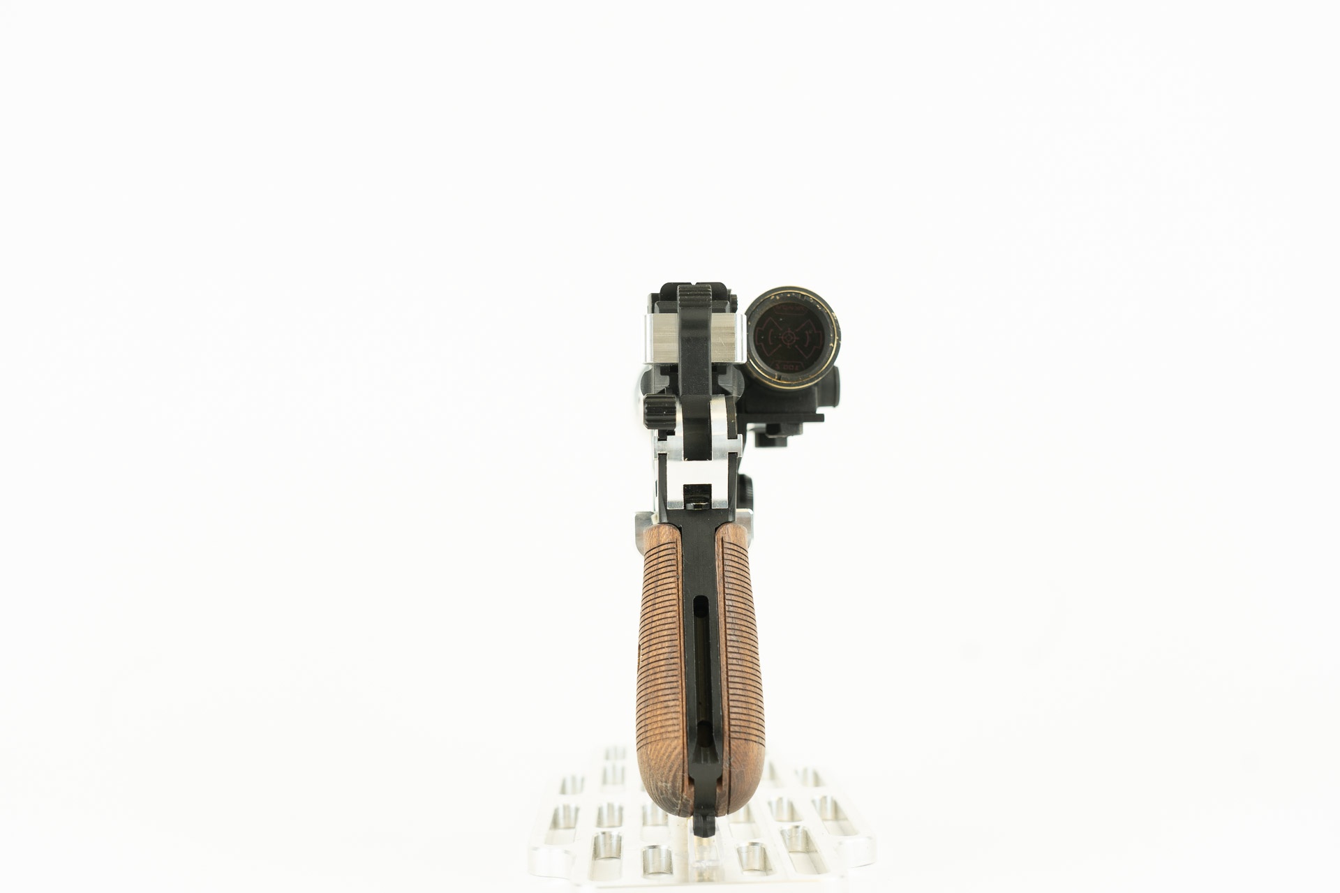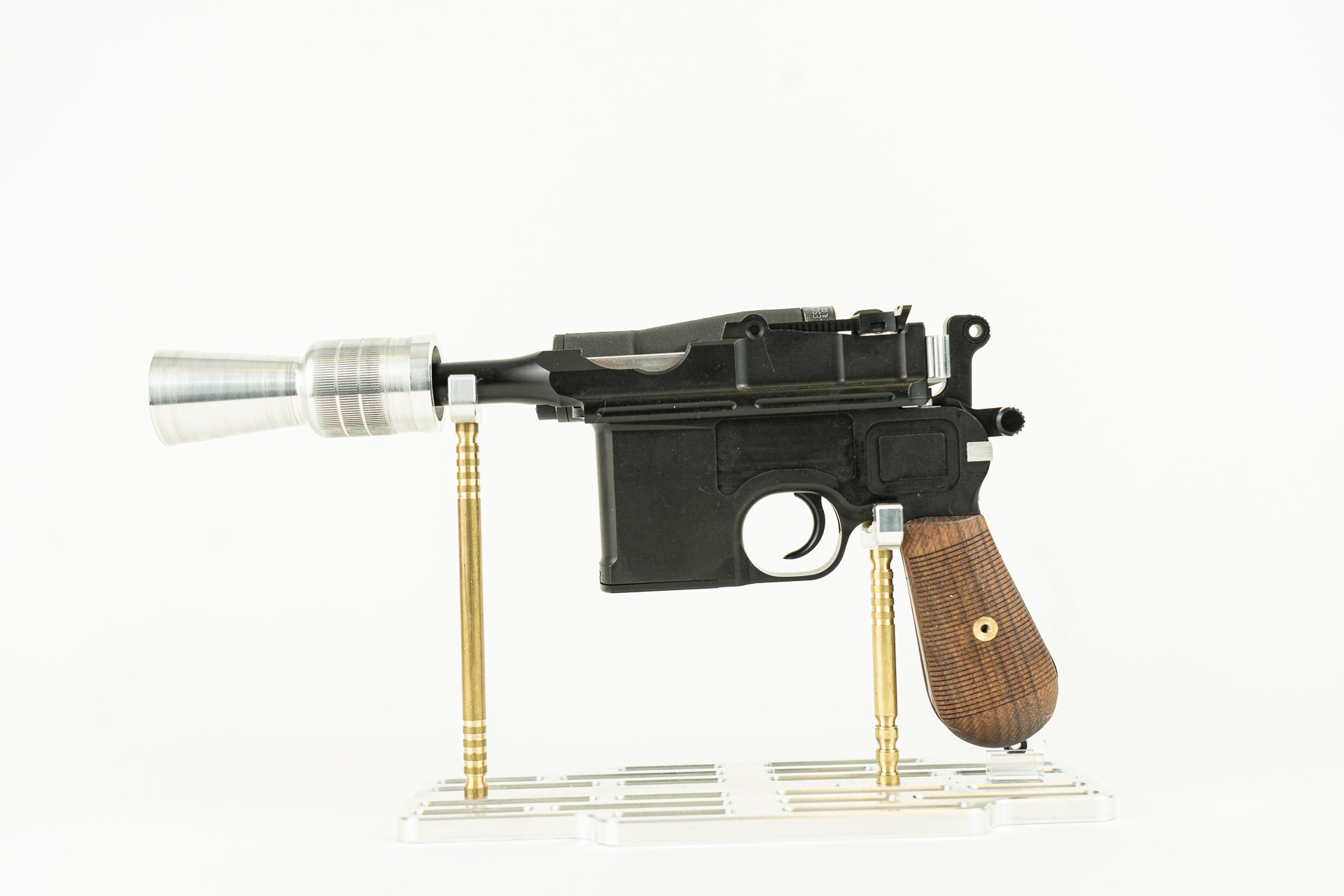 This is laser scanned from a real prewar Mauser and machined for maximum screen accuracy. This features custom made walnut grips, stained with escutcheons and screw, and includes a functional trigger and hammer. Also comes with Bespin aluminum flash hider, Han Bespin scope mount, full port scope, and greeblies.