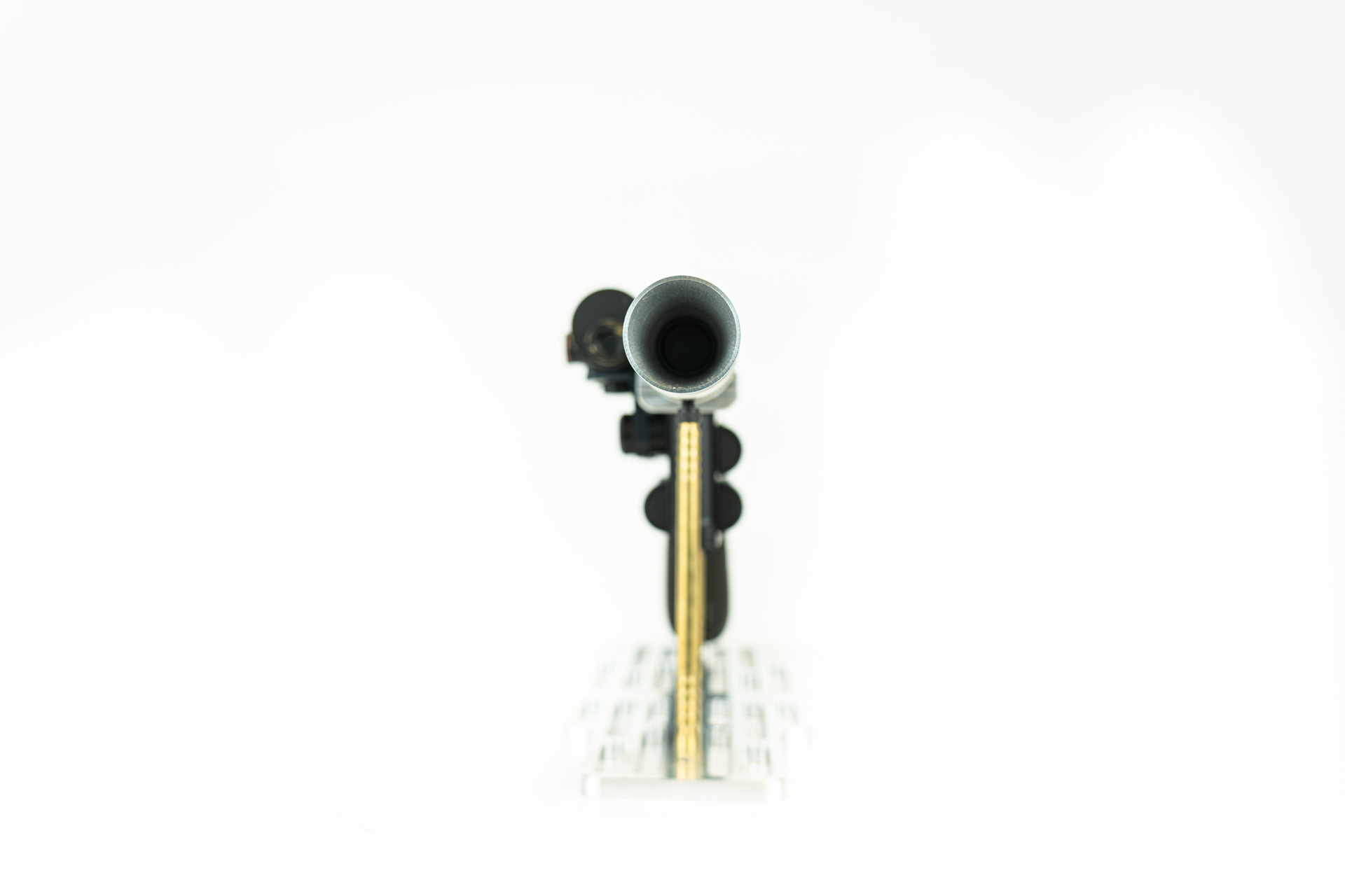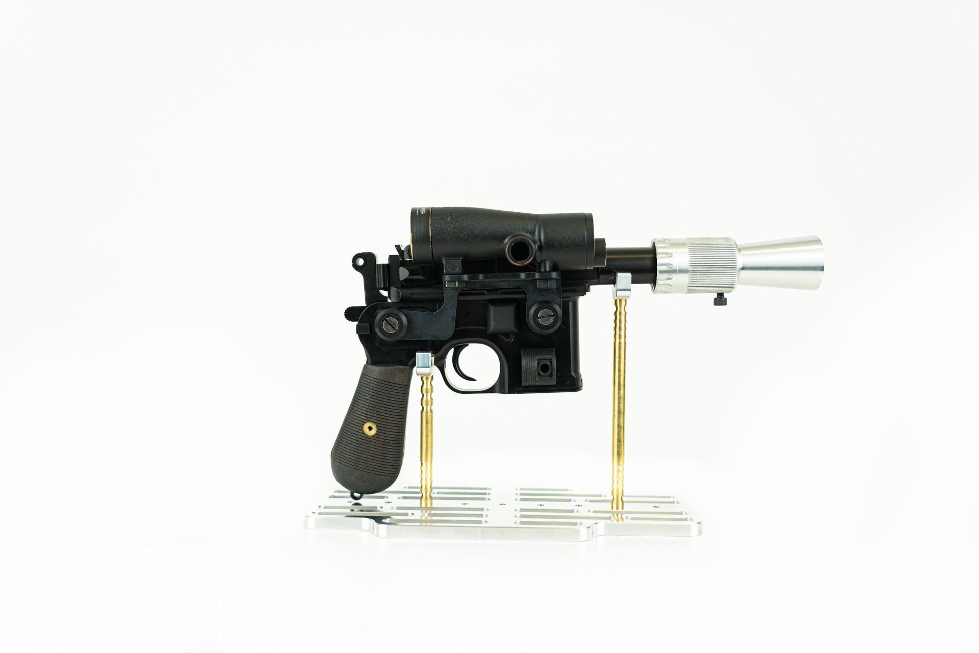 This is laser scanned from a real prewar Mauser and machined for maximum screen accuracy. This features custom made walnut grips, stained with escutcheons and screw, and includes a functional trigger and hammer. Also comes with aluminum flash hider and bull barrel, Dagobah aluminum scope mount, m19 full port aluminum scope replica, and all side greeblies.