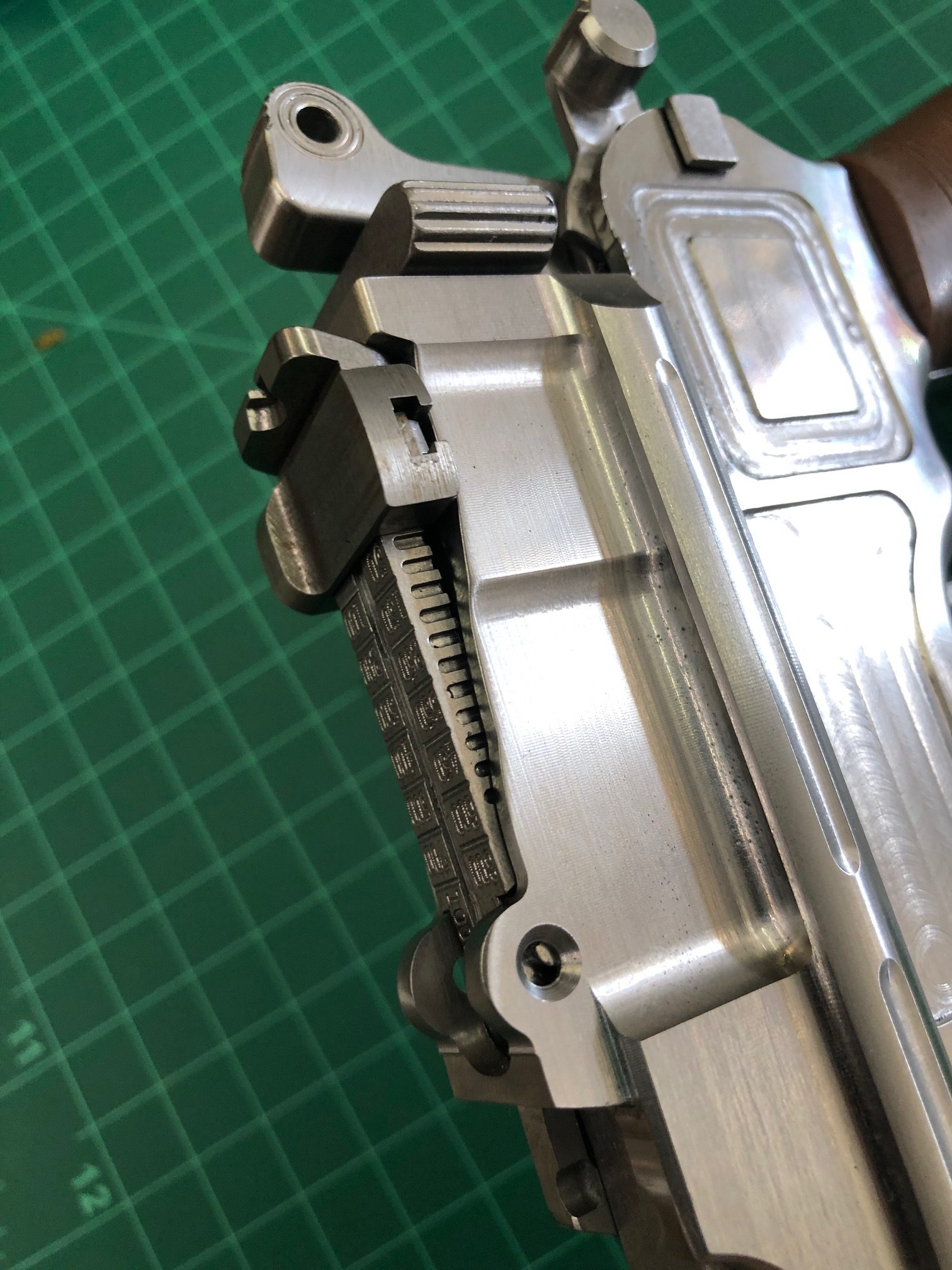 Laser-scanned pre-war Mauser. CNC Machined STEEL replica. C96 DL44 replica. This kit includes everything needed to build a super accurate ANH HERO Replica. Includes functional trigger, safety, and hammer with pre-drilled mounting spots for the Fieldmarshal micro switches. This should make installing electronic sound boards easier. Highly detailed and removable (like the real C96) mag plate allows access to the mag well. Authentic sight, engraved, functional, and mounted like the real counterpart. All inner parts slide into the back just like the real Mauser. All knurls and wording have been painstakingly reproduced and engraved. Pre-drilled scope mount package options available in drop-down box. If you do not want pre-drilled and mounted, please make a note in the order. All other parts and accessories are in the DL44 section of this website, including flash hiders and greeblies, to help with your build.