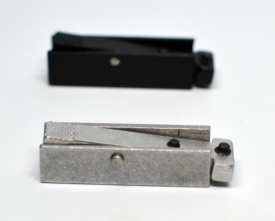 E11 BLASTER ALUMINUM REAR CAP LATCH REPLICA. Laser scanned geometry provide the closest possible replication .KIT IS BLACK ANODIZED… The unfinished one is there for reference only. THE REAL STERLING ASSEMBLY IS IN THE PICTURE FOR COMPARISON ONLY AND IS NOT FOR SALE !!!!!