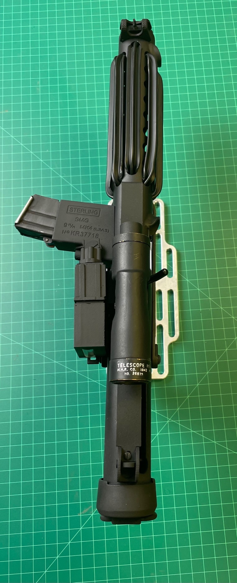 This product replicated from a vintage sterling and screen shots of the e11 blaster. Laser scanned aluminum casted parts and CNC machined to reproduce to perfection.. ..Condition is new as is. Perfect for replica E11 blaster builds. Comes assembled and painted. This is not a real sterling and real surplus parts will not work with the kit !!! THIS IS A E11 BLASTER BASIC BUILD. Last three pic show the assembly and the custom stamping on the mage well parts….