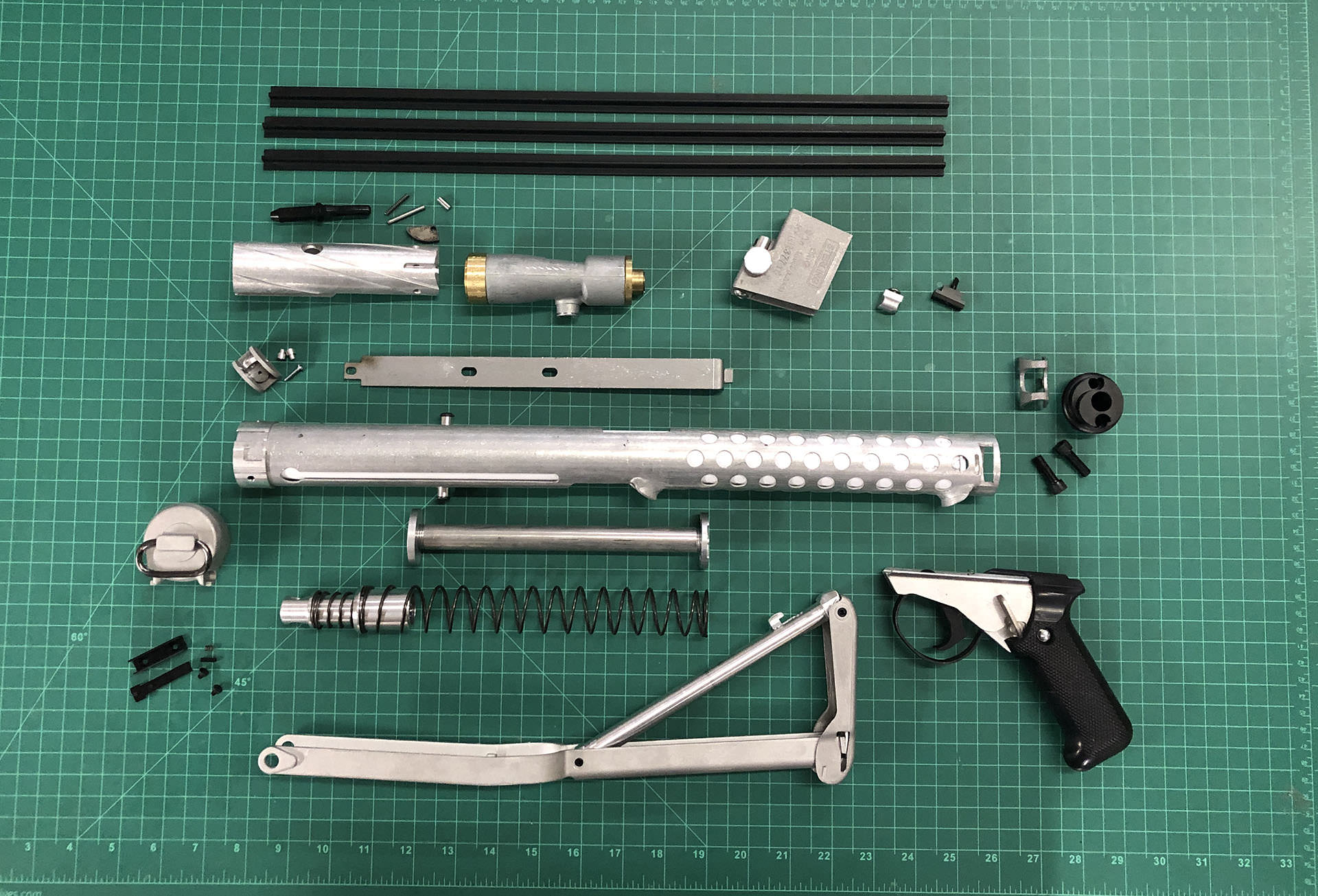 This product replicated from a vintage sterling and screen shots of the e11 blaster. Laser scanned aluminum cast parts and CNC machined to reproduce this assembly to perfection.. Comes with t-track, replica Fieldmarshal Hengstler counter kit,Scope rail, and a M38 replica kit .